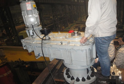 傳動(dòng)裝置由減速機(jī)、輸出齒輪軸、偏心套組件及填料環(huán)組件等幾部分組成。減速機(jī)由變頻調(diào)速電機(jī)經(jīng)限力聯(lián)軸器直接驅(qū)動(dòng),通過(guò)5級(jí)硬齒面圓柱齒輪傳動(dòng),由內(nèi)花鍵軸傳遞給輸出齒輪軸。偏心套、滑動(dòng)軸套和填料環(huán)裝配后經(jīng)聯(lián)結(jié)法蘭和減速機(jī)一起把合在爐體上。可通過(guò)調(diào)整減速機(jī)和偏心套的相對(duì)把合位置來(lái)調(diào)整開(kāi)式齒輪傳動(dòng)的中心距以補(bǔ)償由于高溫產(chǎn)生的形變