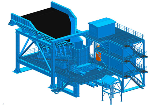 雙齒輥半移動(dòng)破碎站用于千萬(wàn)噸級(jí)以上大型露天礦原煤及剝離物的初級(jí)破碎,其開(kāi)采工藝一般為單斗挖掘機(jī)—運(yùn)輸汽車—半移動(dòng)破碎站—膠帶機(jī)。利用汽車運(yùn)輸?shù)撵`活性,縮短了汽車運(yùn)距,又發(fā)揮了帶式輸送適用于長(zhǎng)距離運(yùn)輸、生產(chǎn)率高、成本低、維護(hù)量小、安全可靠的特點(diǎn),同時(shí)可隨開(kāi)采推進(jìn)定期遷移,機(jī)動(dòng)靈活。