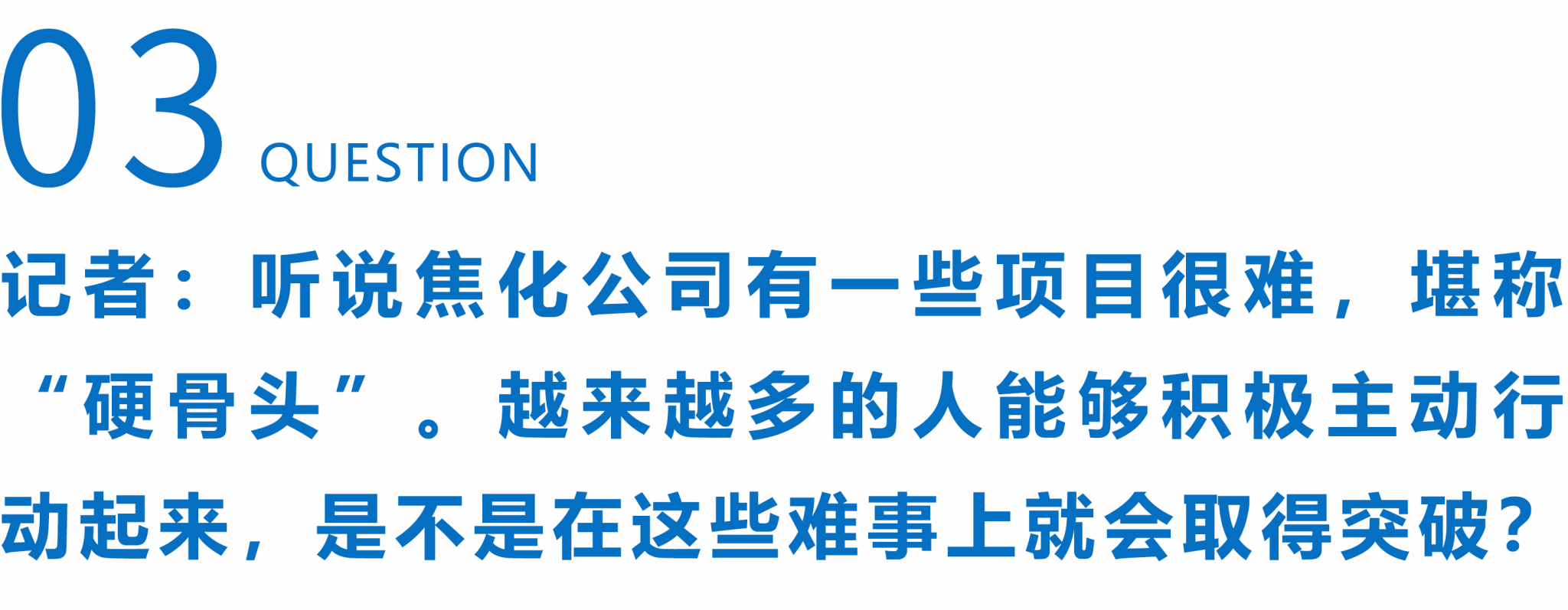 受到環(huán)境影響,焦化公司的干部職工狀態(tài)比較被動,對于我們“能不能行”有焦慮,接受任務(wù)、完成任務(wù)的過程中有思想包袱。所以我們做的第一件事就是為大家卸下包袱,給大家講清楚挑戰(zhàn)和機(jī)遇,鼓舞大家的士氣。同時(shí)我們把資源向積極主動、擔(dān)當(dāng)作為的人傾斜,從精神和物質(zhì)兩個(gè)方面激勵大家。