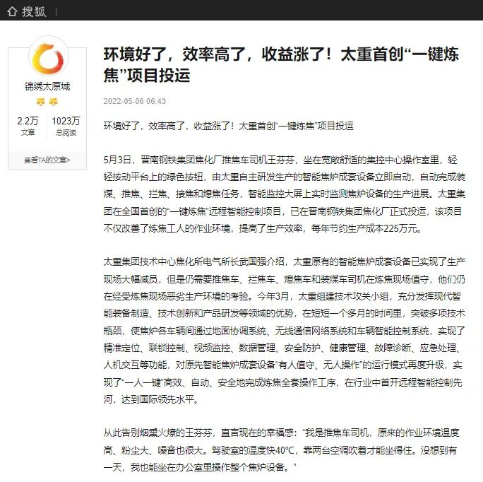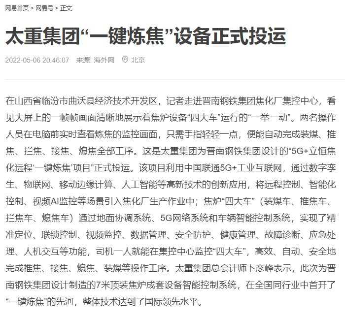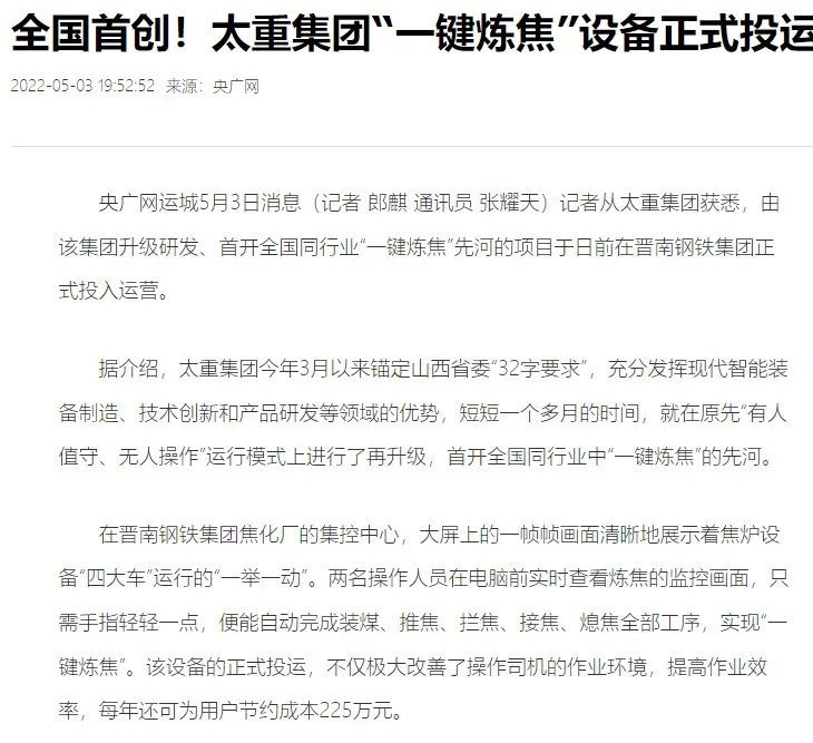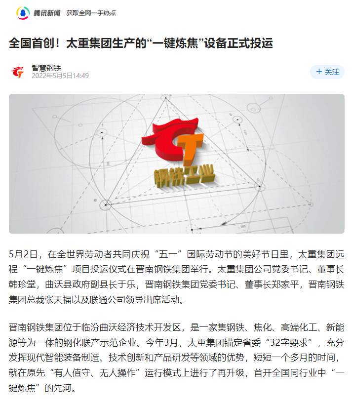 央廣網(wǎng)、中國鋼鐵新聞網(wǎng)、騰訊以《全國首創(chuàng)!太重集團“一鍵煉焦”設備正式投運》為題,聚焦太重集團以科技創(chuàng)新激發(fā)“智造”新活力為出發(fā)點,全面展示“智能+5G”在“一鍵煉焦”上的應用,助力焦化領域效能提升、節(jié)能降耗和轉(zhuǎn)型升級。中國經(jīng)濟網(wǎng)、網(wǎng)易、山西國資以《太重集團“一鍵煉焦”設備正式投運》為題,報道太重集團“一鍵煉焦”項目正式開啟智能煉焦新時代,填補技術空白,開創(chuàng)國內(nèi)焦化行業(yè)先河。搜狐網(wǎng)以《環(huán)境好了,效率高了,收益漲了!太重首創(chuàng)“一鍵煉焦”項目投運》為題,重點展示了太重集團“一鍵煉焦”項目成果,實現(xiàn)智能綠色工廠轉(zhuǎn)型再升級。山西日報、山西晚報、太原日報分別以《首開全國同行業(yè)先河!太重“一鍵煉焦”項目投入運行》《太重大發(fā)明:動動手指“一鍵煉焦”》《太重首創(chuàng)“一鍵煉焦”項目投運》為題,聚焦太重“智造”再提速,充分展現(xiàn)公司以“三性五化”為新產(chǎn)品開發(fā)目標,助力國家實現(xiàn)“雙碳”目標。