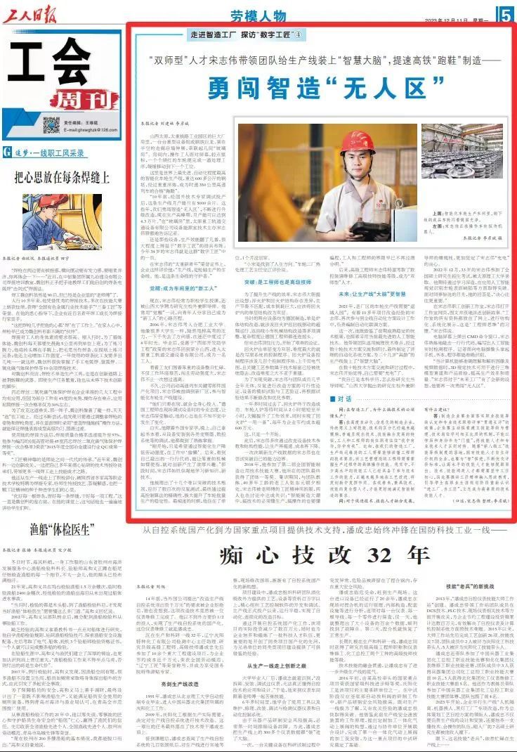 近日,《工人日報》對太重軌道公司設(shè)備能源室技術(shù)主辦宋志偉勇于創(chuàng)新、勇闖智造“無人區(qū)”,為高鐵打造合格“跑鞋”的先進(jìn)事跡進(jìn)行了聚焦報道。從覺醒成為一名新時代的工人到“雙師型”人才的突破,再到勇闖“無人區(qū)”,為生產(chǎn)線裝上了“智慧大腦”,宋志偉不斷攀登科研技術(shù)高峰,攻克多項科技創(chuàng)新難點(diǎn),不斷用熱情和力量踐行著強(qiáng)國有我的青年擔(dān)當(dāng)。