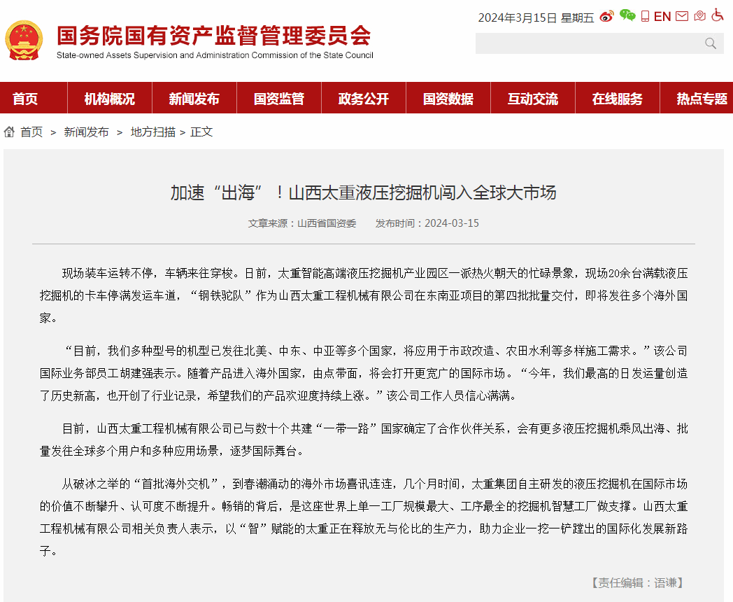 作為裝備制造業(yè)的領(lǐng)軍企業(yè),太重被格外關(guān)注,被寄予厚望。近日,國務(wù)院國有資產(chǎn)監(jiān)督管理委員會官網(wǎng)刊登了《加速“出?!?!山西太重液壓挖掘機闖入全球大市場》;山西新聞聯(lián)播也在《推動高質(zhì)量發(fā)展 深化全方位轉(zhuǎn)型》欄目中對太重進行深入報道。