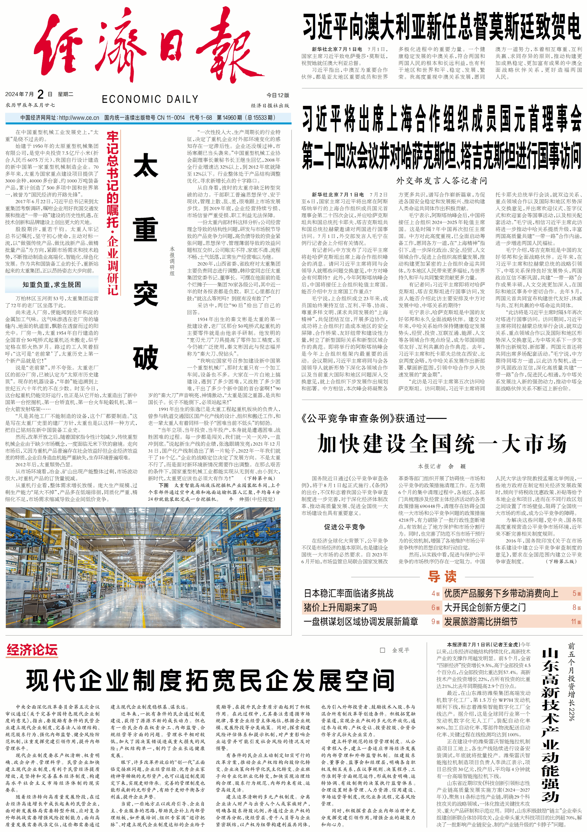 今日,《經(jīng)濟(jì)日?qǐng)?bào)》在【牢記總書記的囑托·企業(yè)調(diào)研記】專欄刊發(fā)文章《太重突破》,頭版頭條、萬字報(bào)道,以太重之變、之最、之智、之綠、之速,展示太重以科技創(chuàng)新推動(dòng)產(chǎn)業(yè)創(chuàng)新的先進(jìn)做法,介紹太重推動(dòng)制造業(yè)振興崛起、實(shí)現(xiàn)“老樹發(fā)新芽”的先進(jìn)經(jīng)驗(yàn)。