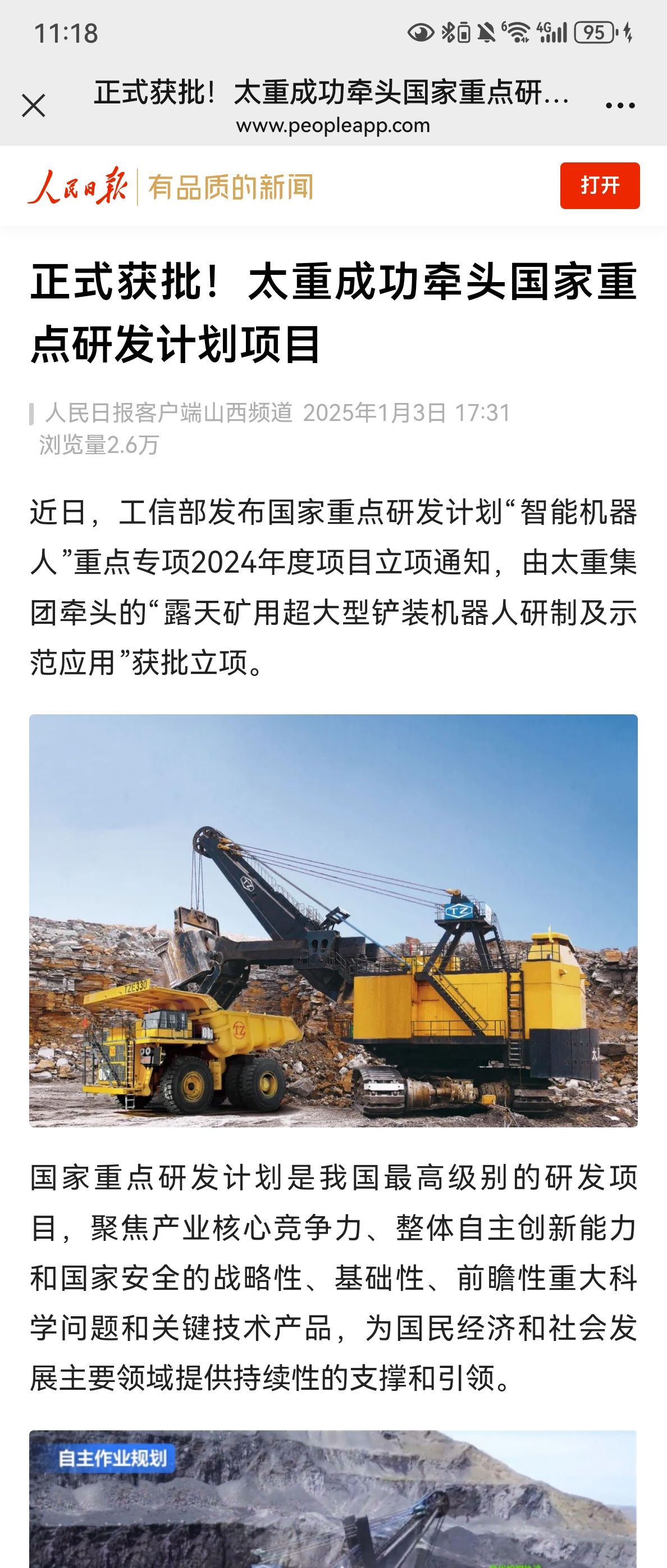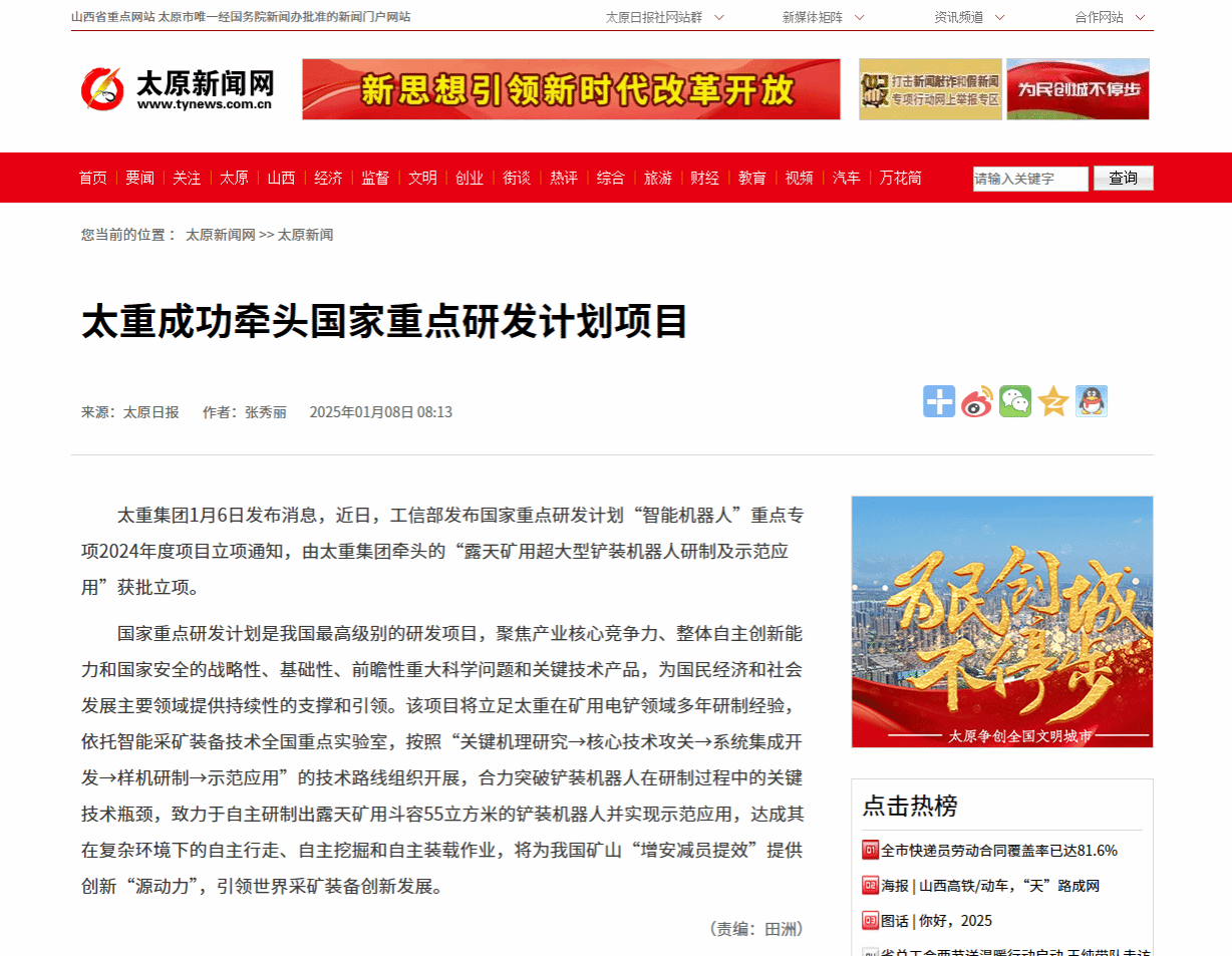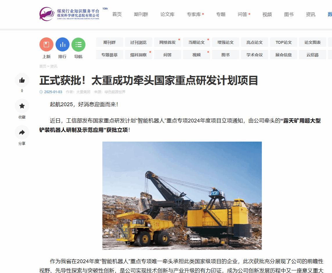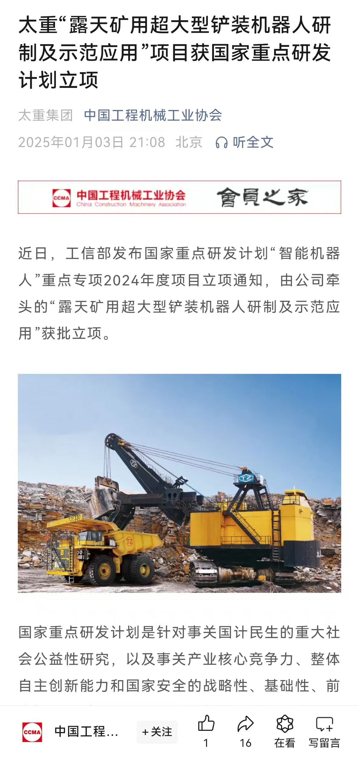 助力我國智慧礦山建設(shè),太重在行動!近日,2024年度國家重點(diǎn)研發(fā)計劃立項結(jié)果公布,公司牽頭的“露天礦用超大型鏟裝機(jī)器人研制及示范應(yīng)用”獲批立項!太重集團(tuán)官微發(fā)布這一消息后,立刻受到人民日報的重磅關(guān)注,彰顯出國家對太重科技創(chuàng)新能力的高度認(rèn)可。與此同時,山西日報、太原日報、中國工程機(jī)械工業(yè)協(xié)會等主流媒體與行業(yè)平臺也迅速關(guān)注,紛紛轉(zhuǎn)發(fā)了太重這一重要突破,刷屏“朋友圈”!露天礦開采技術(shù)的全新智能化時代,在此啟航!