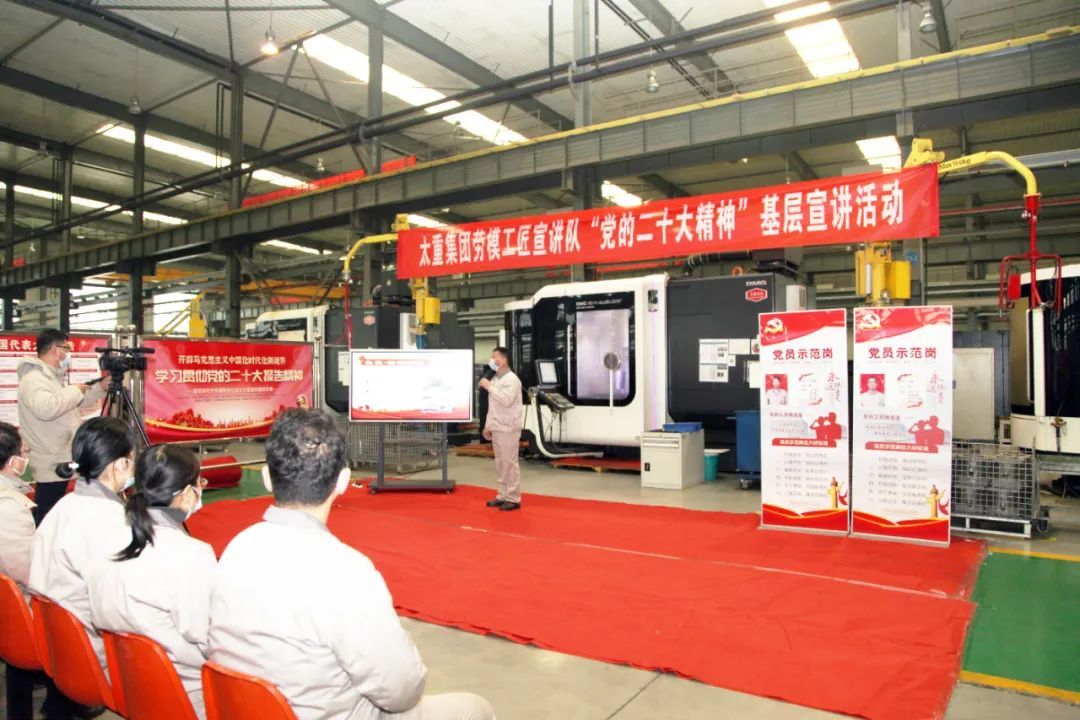 在太重榆液液壓泵分廠車間現(xiàn)場(chǎng),伴隨著機(jī)器的轟鳴聲,黨的二十大精神宣講活動(dòng)也正在火熱進(jìn)行中。集團(tuán)公司“勞模工匠”宣講隊(duì)成員,山西省勞動(dòng)模范、省級(jí)勞模創(chuàng)新工作室?guī)ь^人常永紅,正在為他的工友們宣講黨的二十大精神。生產(chǎn)車間既是他每天工作戰(zhàn)斗的地方,也是他宣講黨的創(chuàng)新理論的陣地。他結(jié)合崗位實(shí)際談心得、說體會(huì)、講感受,推動(dòng)黨的二十大精神走進(jìn)基層一線、走進(jìn)職工心里,唱響新時(shí)代奮斗者之歌。